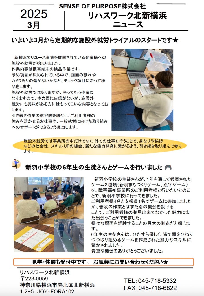 2025年3月号は、施設外就労のトライアル開始のお知らせです。お問い合わせをお待ちしています。