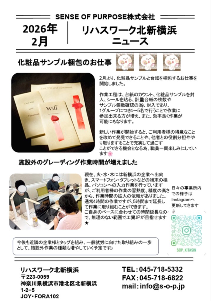 リハスワーク北新横浜ニュース26年2月号をお届けします。新しいお仕事が増えており、一般就労に向けた取り組みも進めています。新たな職員も募集中!インスタグラムも更新中!